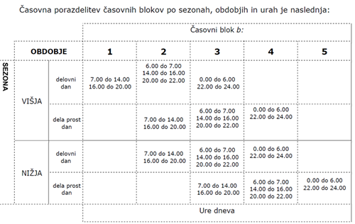 Časovnih blokov je pet, v posameznem dnevu pa lahko nastopijo trije različni časovni bloki. Najdražji je časovni blok 1, ta se pojavi le v višji sezoni, najcenejša je uporaba omrežja v časovnem bloku 5, ki nastopi le v nižji sezoni.